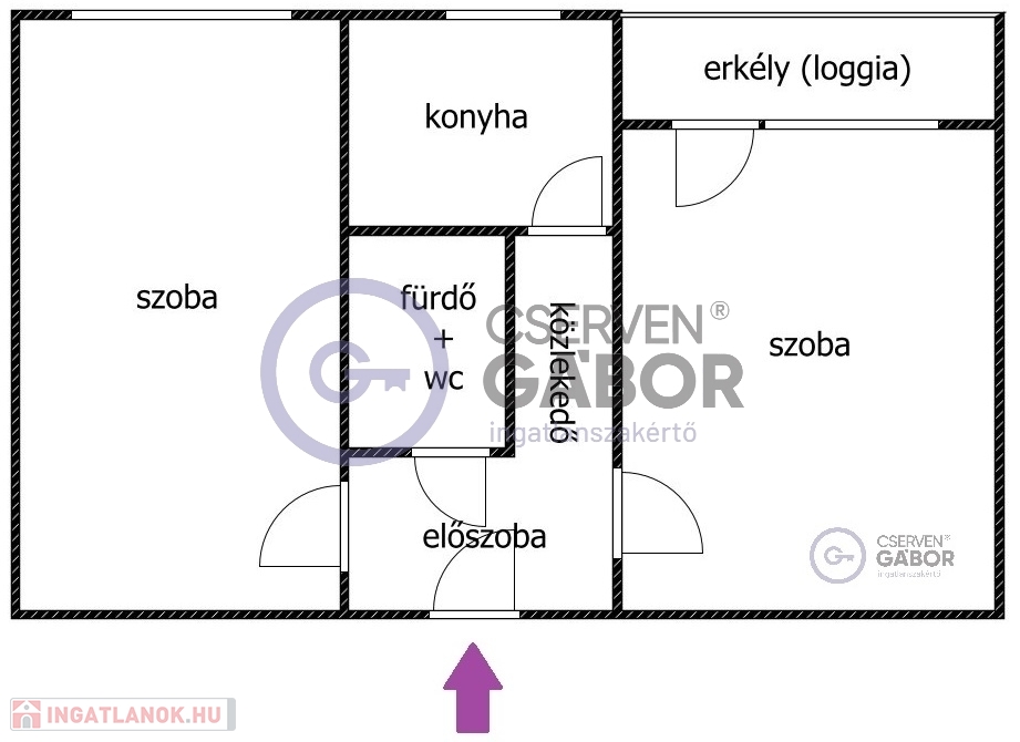 Elrendezés szerint az 51 m2 magába foglal két tágas szobát, egy normálméretű konyhát, egy előszobát, és egy innen nyíló zuhanyzós fürdőt, ami a WC-t is magában foglalja. A szélesebb szobához tartozik a már említett --erkély, ami valójában lodzsa, így zárt oldalakkal és födémmel rendelkezik. A lodzsa, a praktikum jegyében, ablakokkal került lezárásra, így télen-nyáron használható, akár kiülni, akár ruhákat teregetni, vagy akármire is.