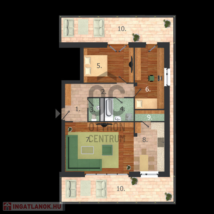--kiváló elrendezés, minden szobából tolóajtón keresztül elérhető tetőterasz.
