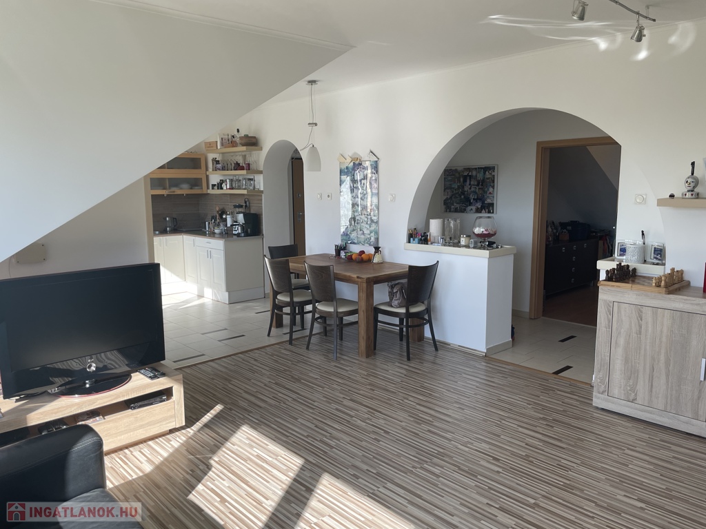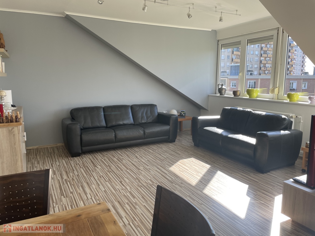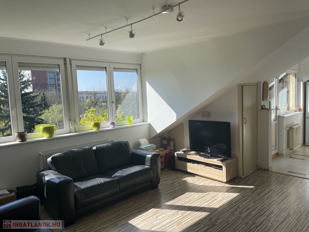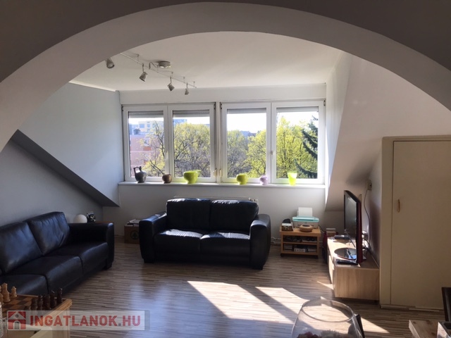 Belvárosban az Erkel ker szélén eladó egy bruttó 76 m2, hasznos 57 m2-el, egy egész és egy fél szobával, világos és tágas nagy nappalival rendelkező tetőtéri lakás!