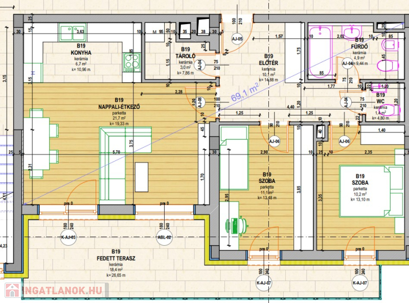 (változtatható)A nappali és a hálószobák laminált parketta padlóburkolattal, az egyéb helyiségek hálósan rakott mázas kerámialap padlóburkolattal készülnek. A WC-k és fürdőszobák falain 2,20 m magasságig, a konyhákban a tervezett beépítésnek megfelelően az alsó és felső elemek közti 60 cm magasságú sávban készül (mindenhol hálós formációban rakva) csempeburkolat. Az alábbi m2 anyag áru burkolatokat tartalmazza a lakás vételára: