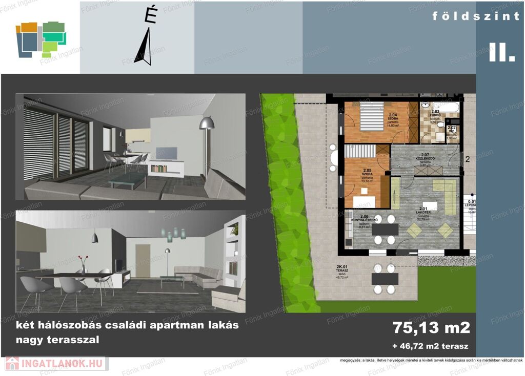 A lakás amerikai konyhás nappaliból, 2 hálószobából, fürdőszobából + WC-ből, külön WC-ből, közlekedőből, valamint a tágas teraszból áll.