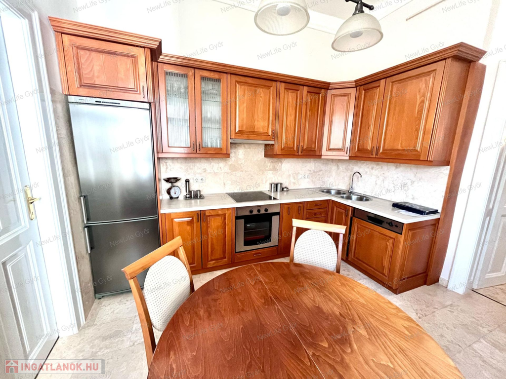 A konyha szép, asztalos által készített konyhabútorral rendelkezik. A méretéből adódóan az étkezőasztal is kényelmesen elfér. Ahogy a laksá többi része is, a konyha is szép, világos.