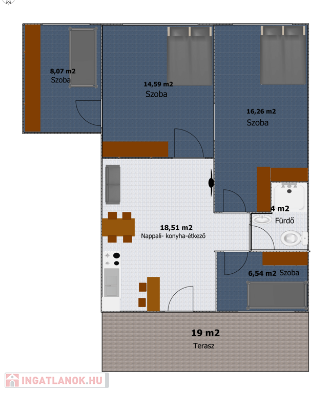 Félig fedett terasz: 19 m2, Lakás alapterülete: 68 m2