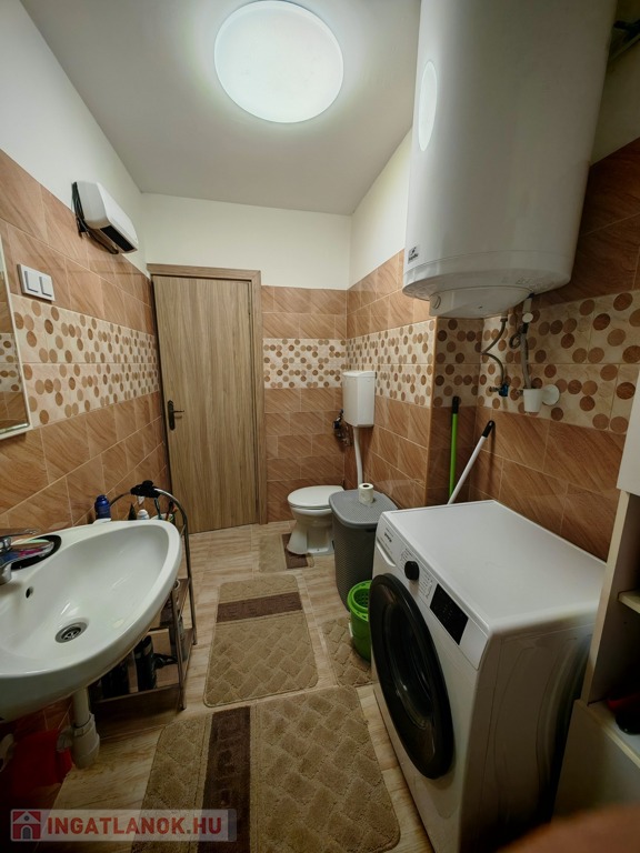 - A fürdőszobában modern burkolatok és szaniterek lettek beépítve