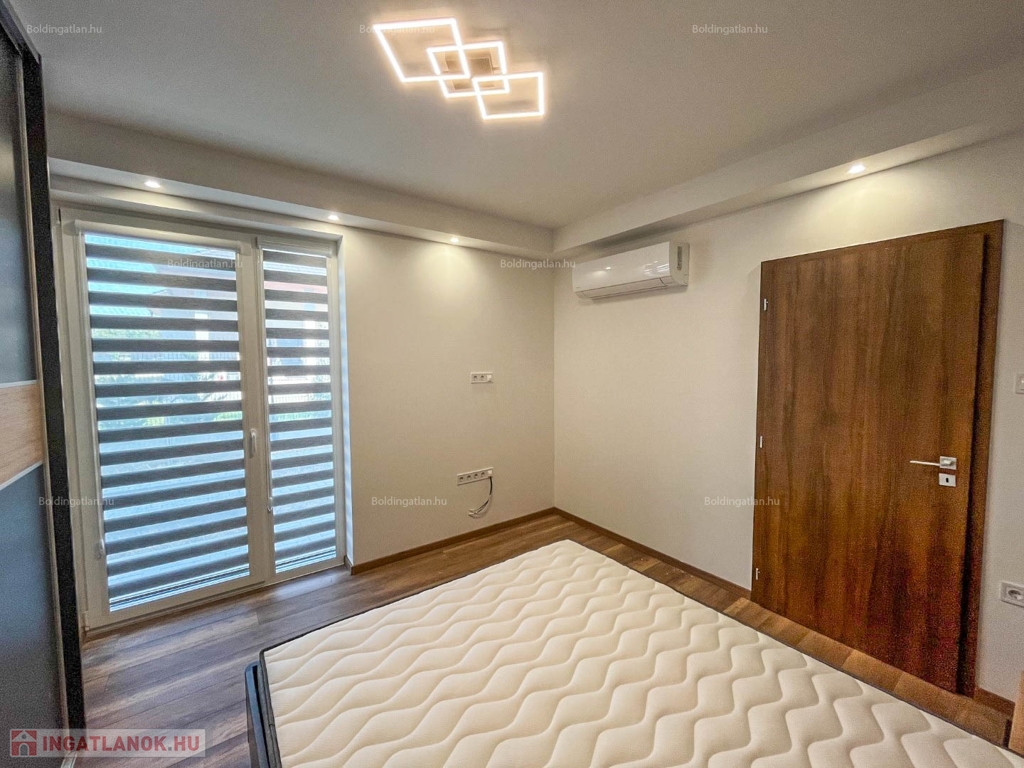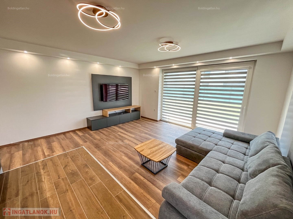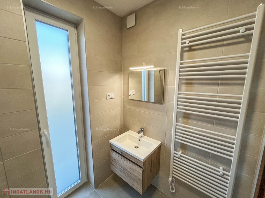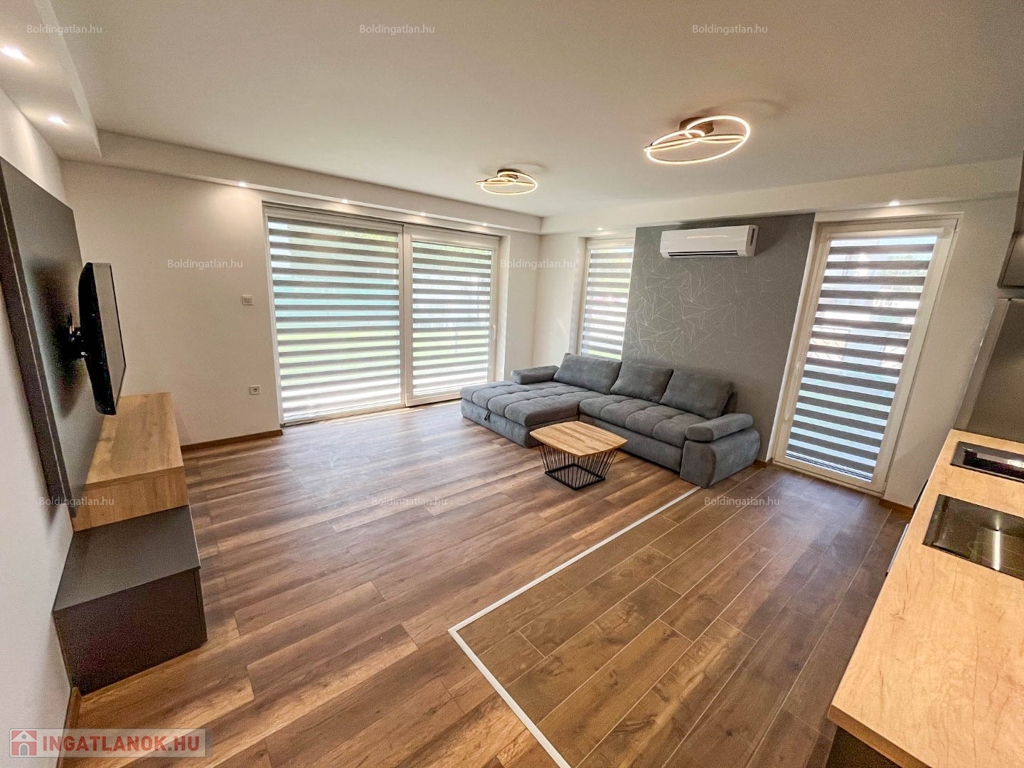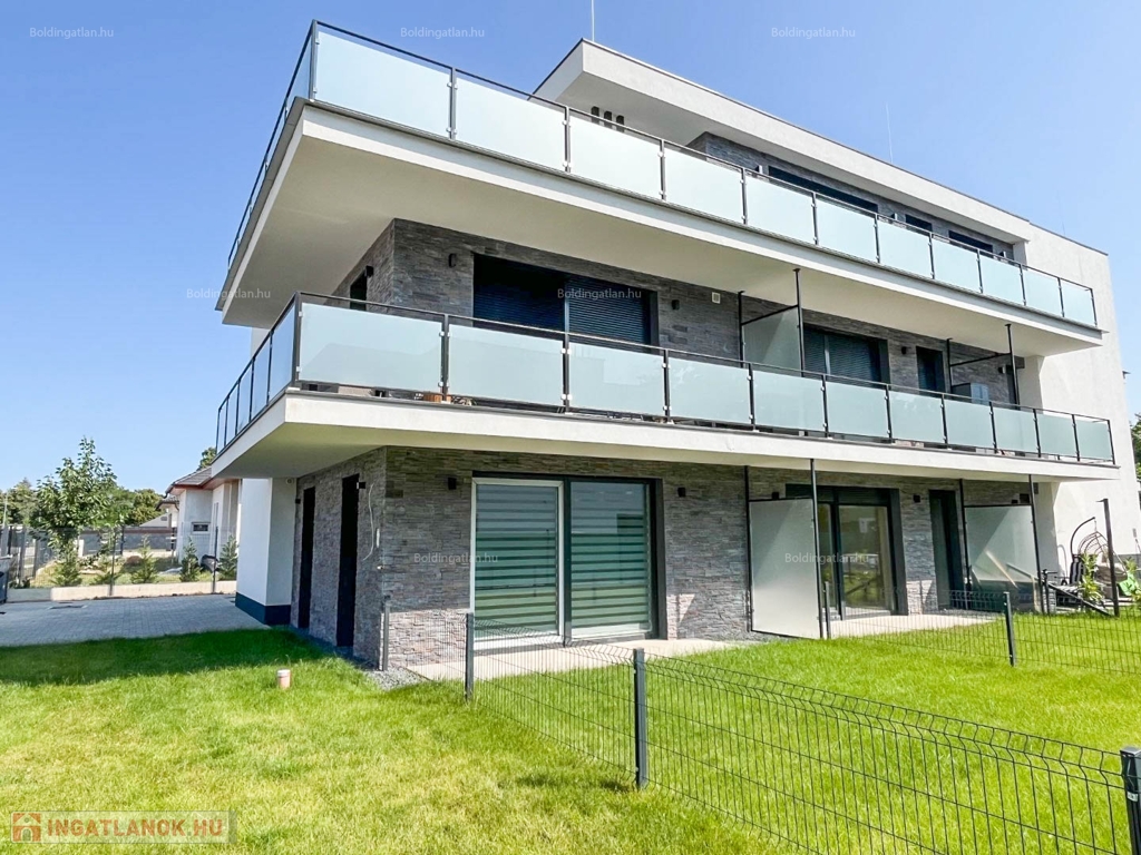 Siófok kertvárosában, Sóstón - a Balaton parttól csupán 15 perc kényelmes séta távolságra, az autópálya lehajtótól és a belvárostól autóval néhány percre - igényes környezetben lévő, magas minősében kivitelezett új építésű 6 lakásos társasház földszintjén 53 m2-es - azonnal költözhető - modern lakás a képeken látható berendezéssel együtt eladó. A lakásban nappali-konyha-terasz, 1 szoba, közlekedő, fürdőszoba, wc helyiségek kerültek kialakításra. A lakás fűtése hőszivattyúval - padlófűtéssel - megoldott, a melegvizet intelligens Ariston bojler szolgáltatja, valamint 2 db légkondicionáló, automata redőnyök, és riasztó is felszerelésre kerültek. Továbbá tartozik hozzá 40 m2-es udvari rész és 1 személyautó részére kialakított parkolóhely is. A társasházon napelem van felszerelve, erről üzemelnek a lakásonkénti hőszivattyúk, az elektromos fogyasztók és a medencéje (3mx5mx,1,5m).