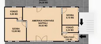 A 37 m²-es amerikai konyhás nappali tágas és világos, tökéletes közösségi tér. A két különálló hálószoba biztosítja a privát szférát. Két fürdőszobával rendelkezik, ami kényelmes mind családok, mind vendégek számára.