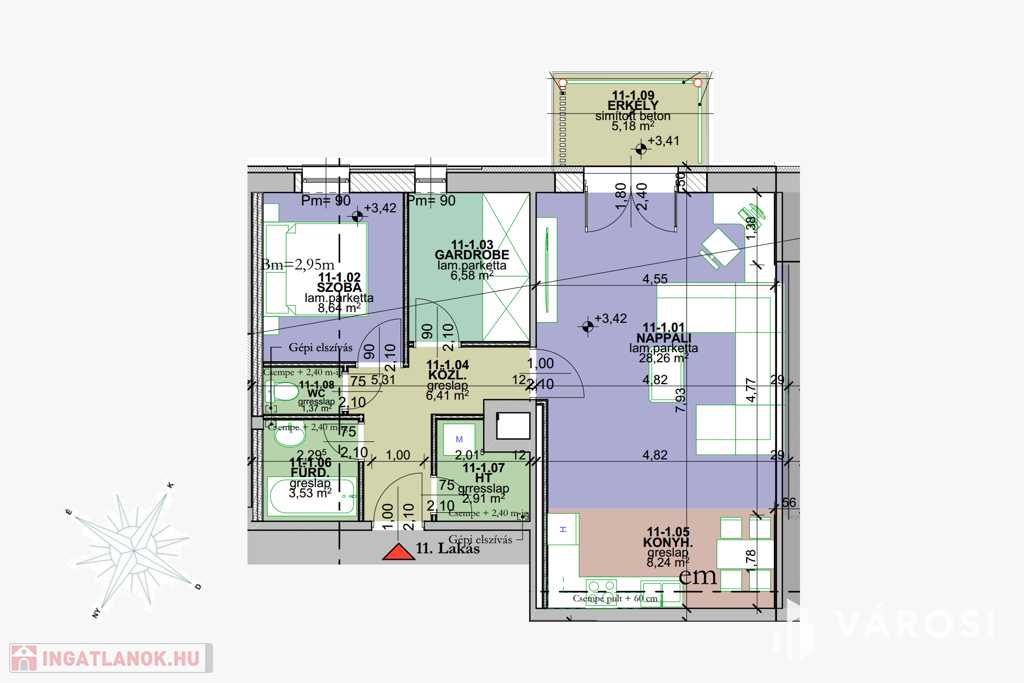 Az emeleten levő 65,94 négyzetméteres 11. lakás a következő helyiségekkel kerül kivitelezésre: nappali, szoba, konyha, gardróbszoba, háztartási helyiség, fürdőszoba és egy 5,19 négyzetméteres erkély. Ára: 71 684 550 Ft.