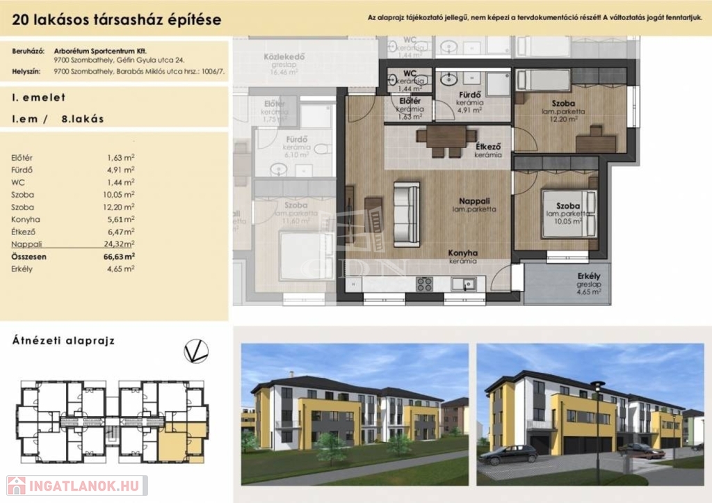 A három szintes kettő emeletes, 20 lakásos modern társasházak minden igényt kielégítő, magas műszaki tartalommal valósulnak meg. A kiváló tájolású 40-67 m2 közötti ingatlanokat nagyon jó elosztás és élhető terek jellemzik. A lakások nappali+egy , nappali +kettő szobásak lesznek. A földszinti lakások komfortérzetét teraszok, saját kertek az emeleti lakásokét jó méretű erkélyek fokozzák. Nyílászárói 3 rétegű fokozottan hő- és hangszigetelt üvegezésű műanyag ablakok és erkélyajtók, redőny fogadására alkalmas szemöldök kialakítással. A lakások bejárati ajtaja MABISZ minősítéssel rendelkező tömör, több ponton záródó biztonsági ajtó. Fűtése központi gázfűtés tervezett, kondenzációs gázkazánnal a lakásokban egyedi hőmennyiség szabályozással és mérővel, padlófűtéses hőleadással. Klímaelőkészítést a vételár magában foglalja. Hideg -meleg burkolatok ,szaniterek, csaptelepek, beltéri ajtók választhatók. Az ingatlanhoz felszíni parkoló, garázs vásárolható.