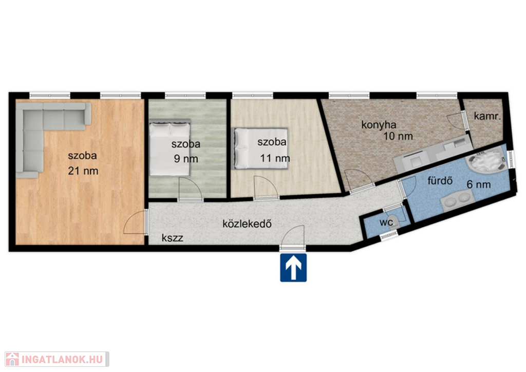 - 3 külön álló szoba, konyha, fürdő, WC, közlekedő.