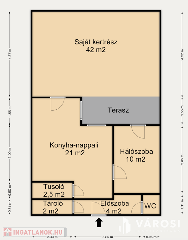 A 42 m2-es elkerített privát udvarrész télen-nyáron alkalmas a kikapcsolódásra, a kényelmes méretű terasz pedig a nyári grillpartiknak tud otthont adni.