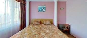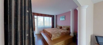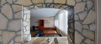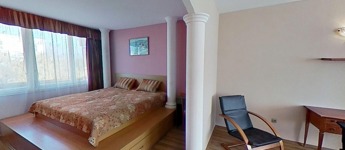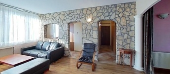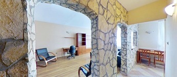 A klimatizált lakás egyedi megjelenését a hálószobában az oszlopok, a dobogós ágy, és a tereket részben leválasztó rusztikus hatású kőfal adja. Lényegében a fürdő és az illemhelyiség kivételével nincsenek elválasztó ajtók, így a nappali, előtér, konyha és hálószoba egy légtér. Az előtérben egyedi tervezésű mindent elnyelő beépített szekrény kapott helyet. A lakás gépesített, bútorozottan kerül bérbeadásra.