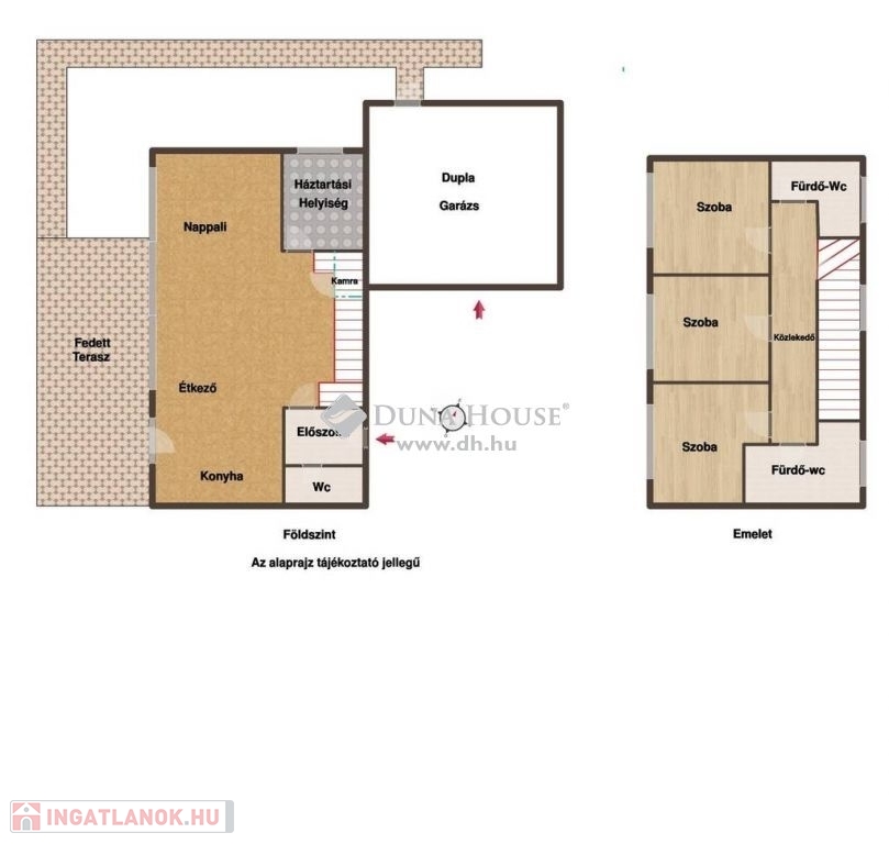 A földszinten a tágas, világos, nappali -konyha- étkező mellett kamra, háztartási helyiség, wc-kézmosóval, hatalmas fedett terasz és egy dupla garázs is helyet kapott.